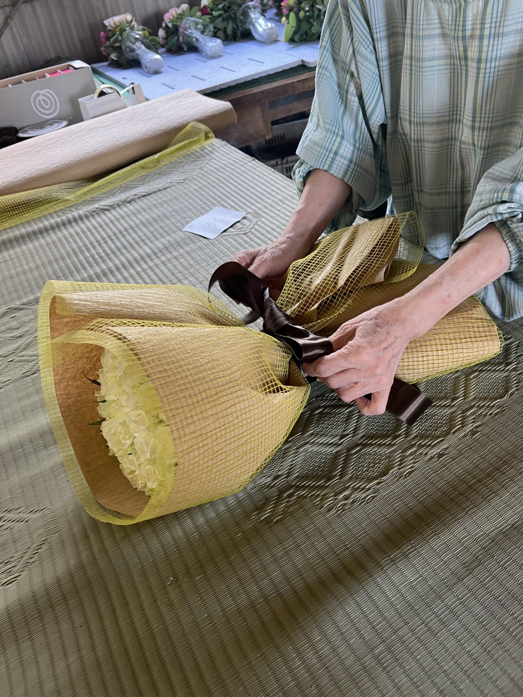 お邪魔した時、丁度 注文を受けた花束の制作中。これがまたシンプルで素敵です。