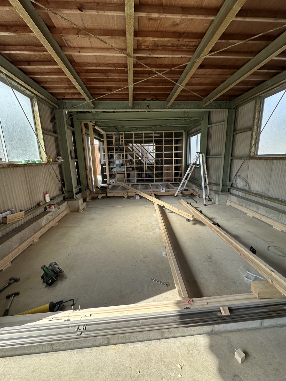 農業用倉庫の内部に新たに壁や下地を組み、作業スペースをつくる工事を行っています。