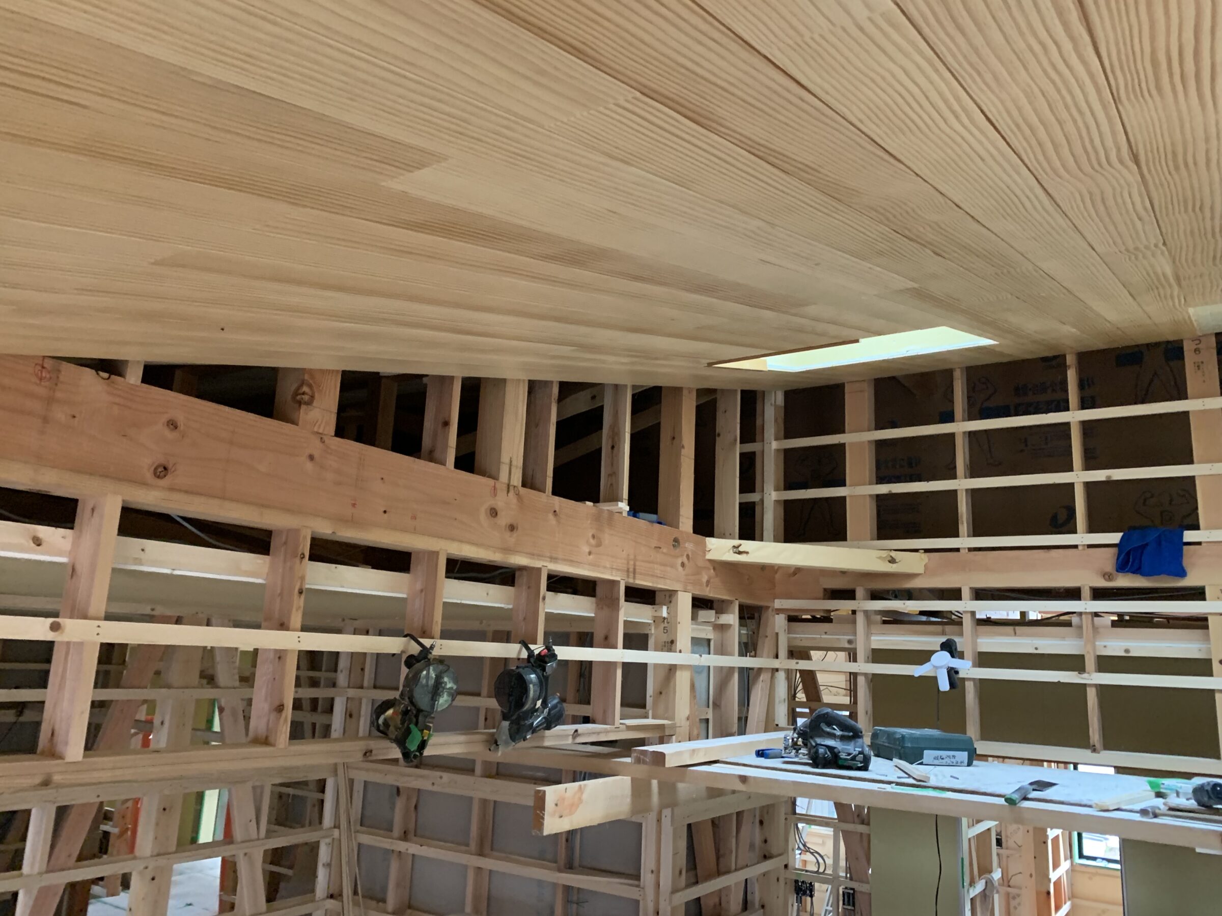 リビングの天井板を貼っています。 無垢板を丁寧に1枚1枚繋いでいきます。 木の美しさ、触れ心地。無垢ならではの質感と優しさ。 立体的な空間へと広がりますね。…